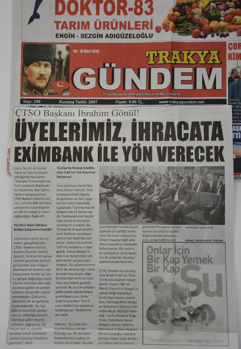 Üyelerimiz, İhracata EXIMBANK İle Yön Verecek - 03-16 Mart 2018 - Trakya Gündem
