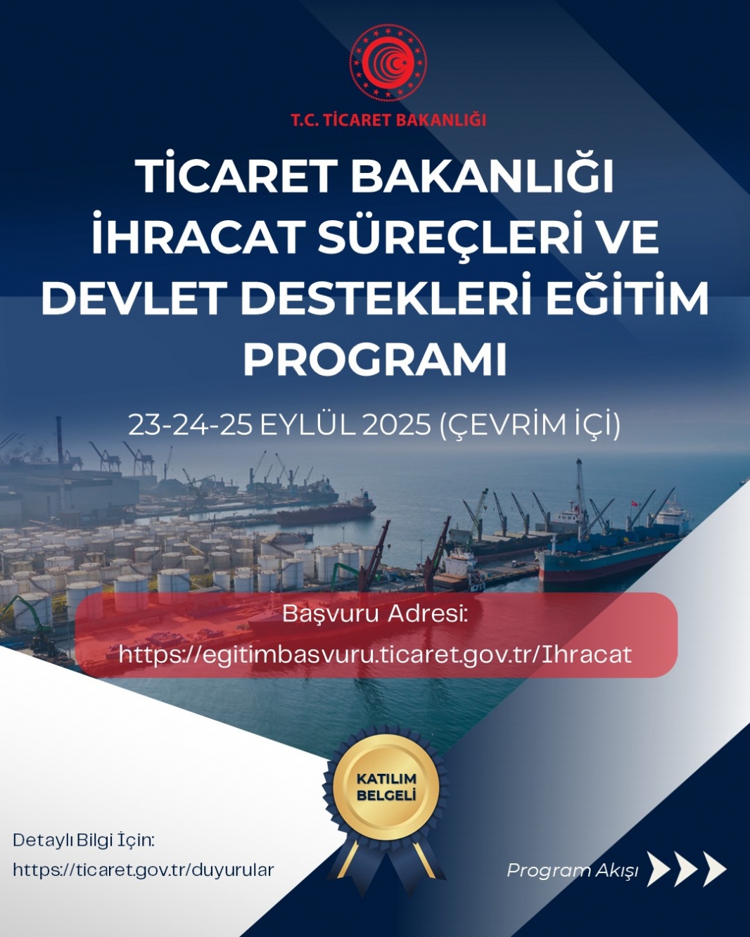 Ticaret Bakanlığı tarafından düzenlenen “İhracat Süreçleri ve Devlet Destekleri Eğitim Programı” 23-24-25 Eylül tarihleri arasında çevrim içi olarak gerçekleştirildi.