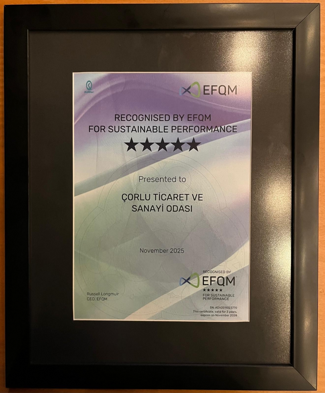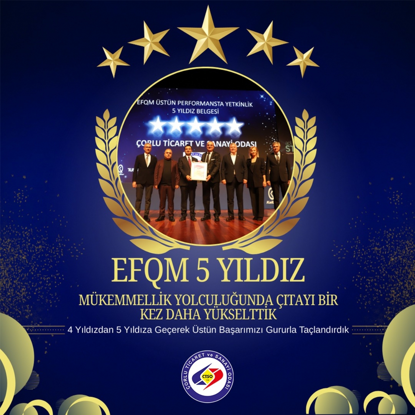 Törende Çorlu Ticaret ve Sanayi Odası; dünyada 35 binden fazla kuruluşun yönetim modeli olarak benimsediği “Avrupa Kalite Yönetim Vakfı (European Foundation for Quality Management) (EFQM) Mükemmellik Modelinin” kriterleri doğrultusunda verilen ve kurumsal çalışmaları sayesinde iş dünyasının en prestijli ödülleri arasında gösterilen EFQM Üstün Performansta Yetkinlik 5 Yıldız Belgesi’ne sahip oldu.