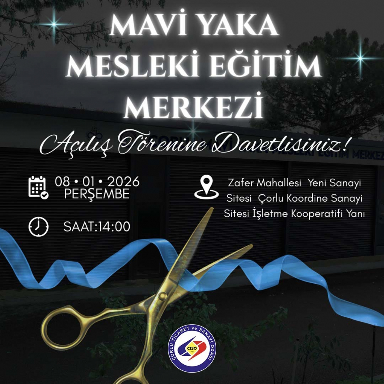 Çorlu Ticaret ve Sanayi Odası, Çorlu Belediyesi, Çorlu İlçe Milli Eğitim Müdürlüğü, Çorlu Koordine Sanayi Sitesi İşletme Kooperatifi, Çorlu Koordine Küçük Sanayi Sitesi Site Yönetimi ortak projesi ile 8 Ocak 2026 tarihinde saat 14:00’de gerçekleşecek olan “Çorlu Mavi Yaka Mesleki Eğitim Merkezi”nin Açılış Töreni’nde sizleri de aramızda görmekten memnuniyet duyarız.